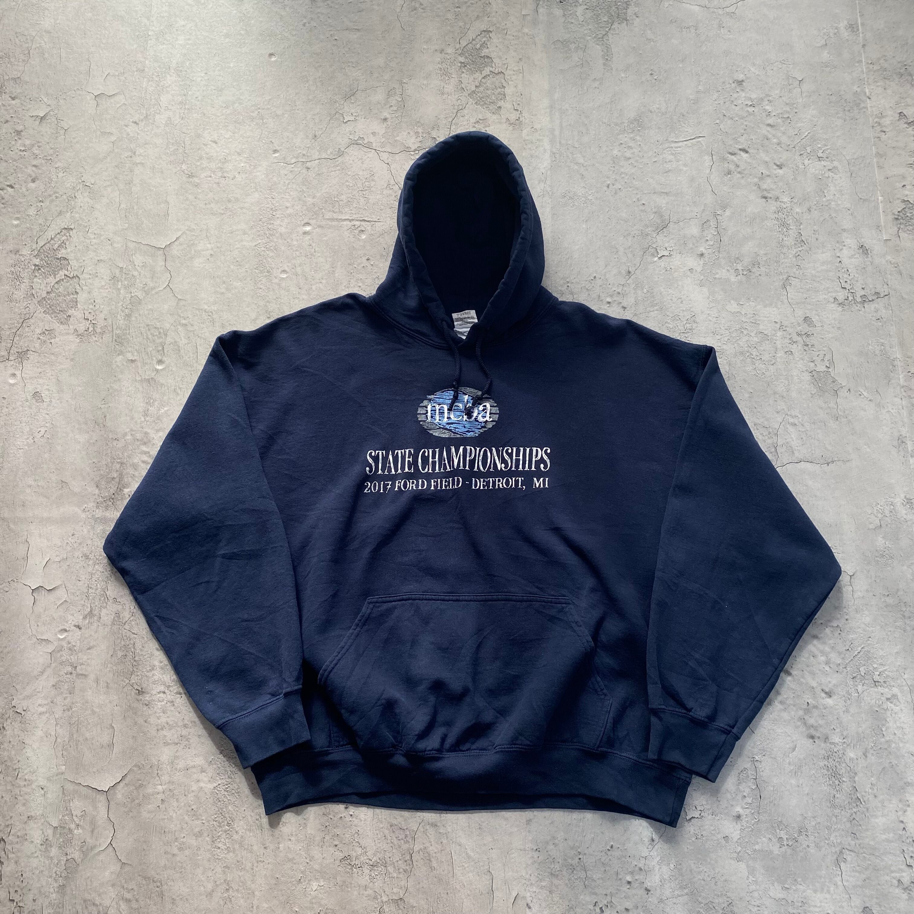 ギルダン USA古着 バックプリント パーカー スウェット フーディ ネイビー