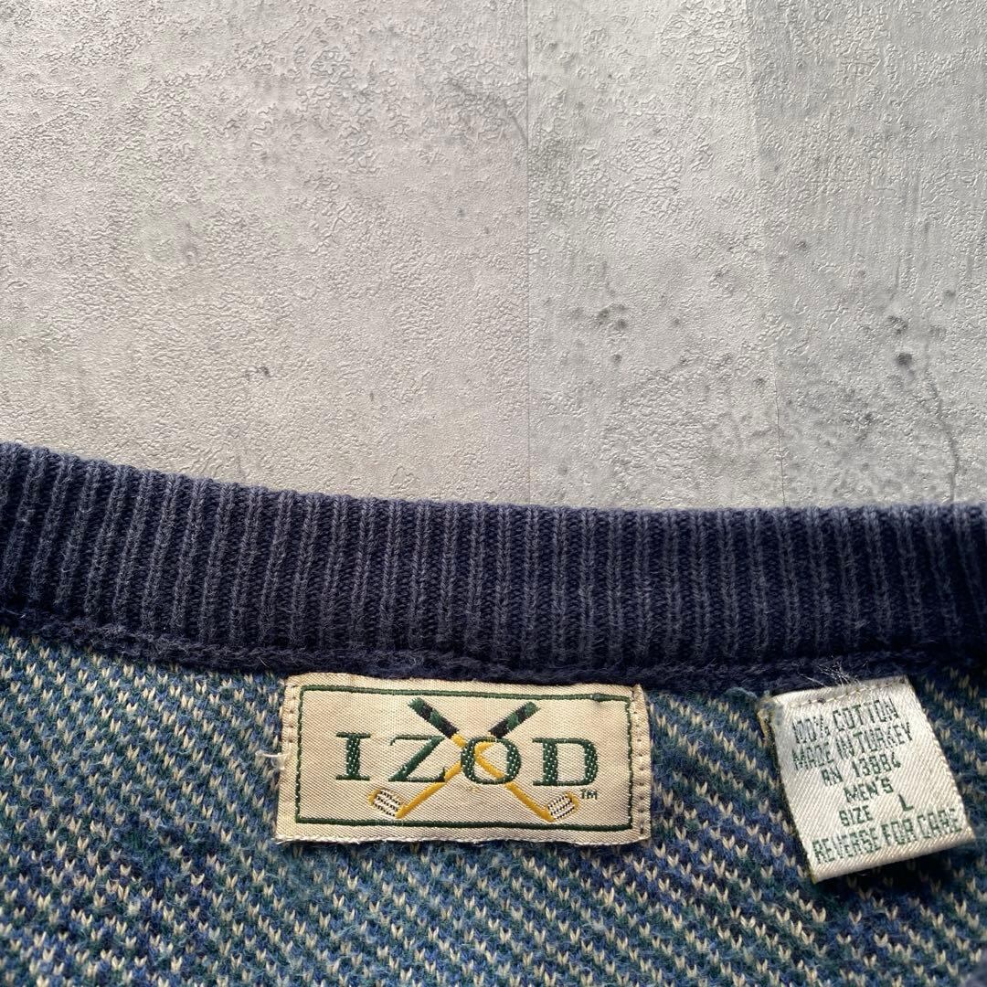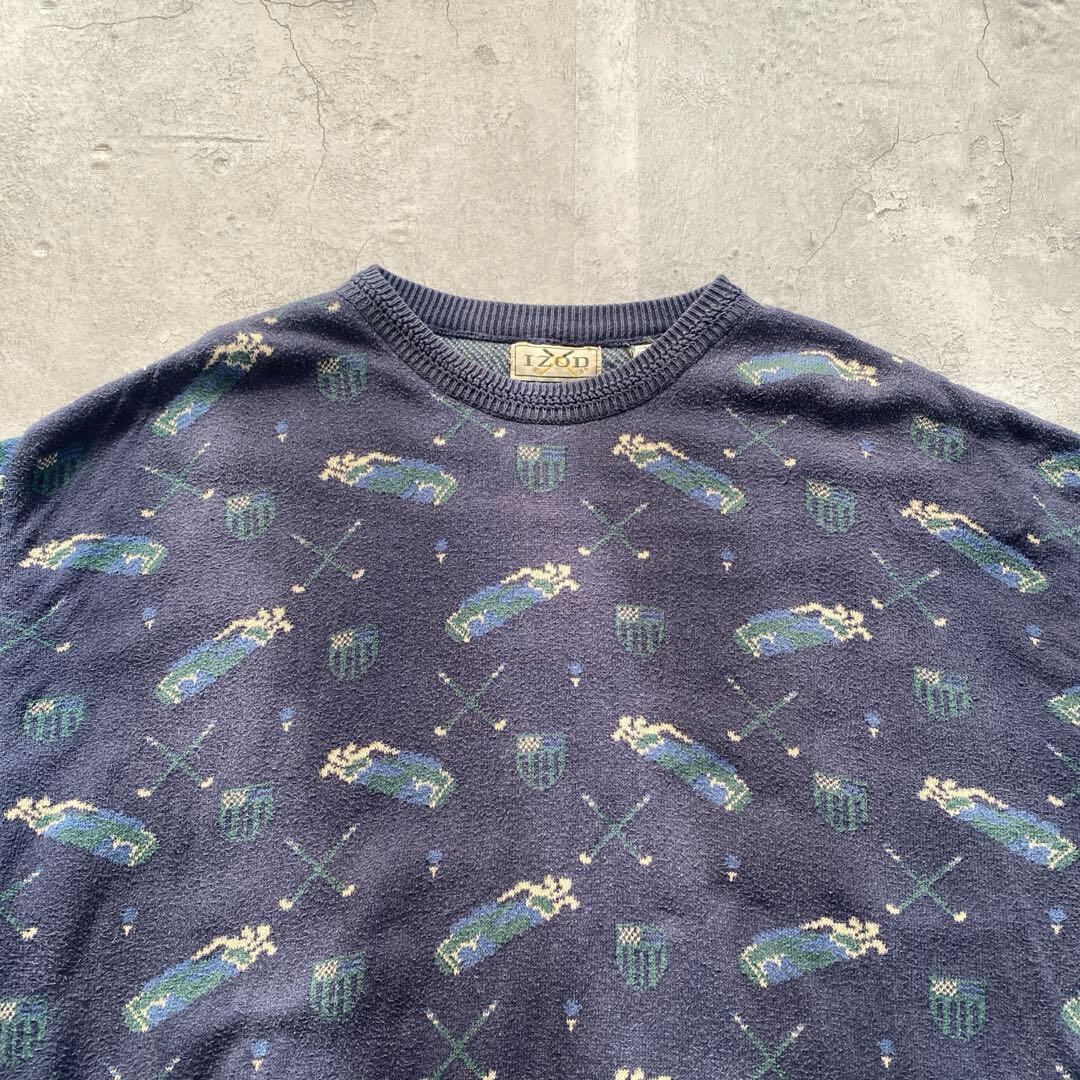 90’s IZOD USA古着 総柄 コットンニット デザイン ネイビー マルチ