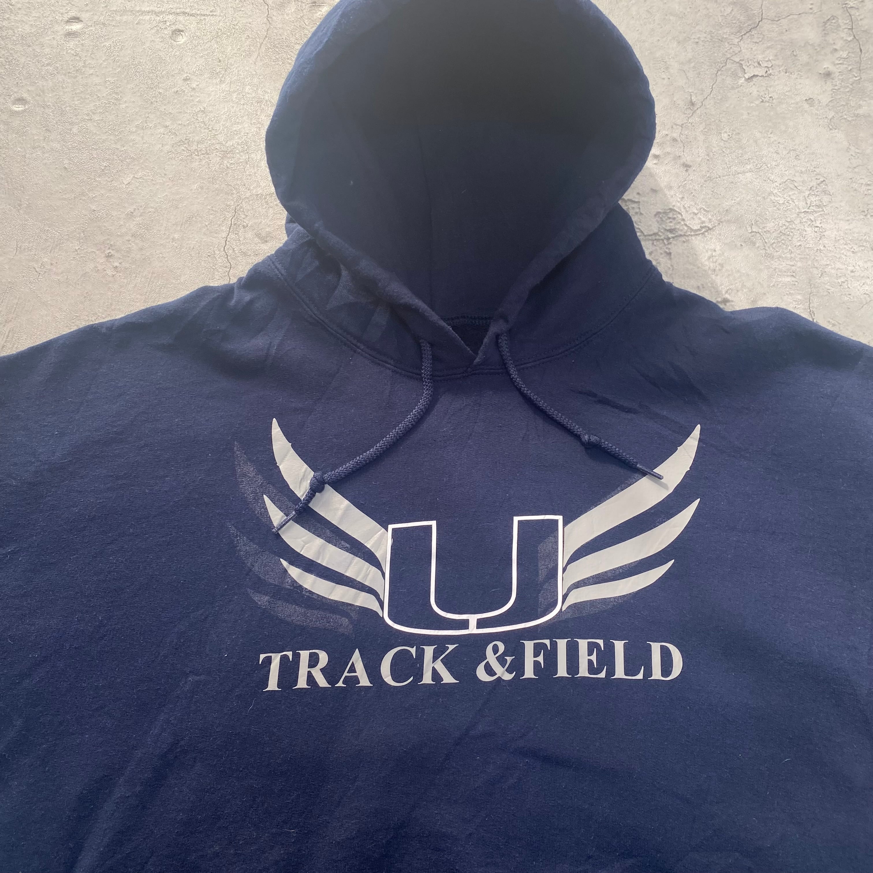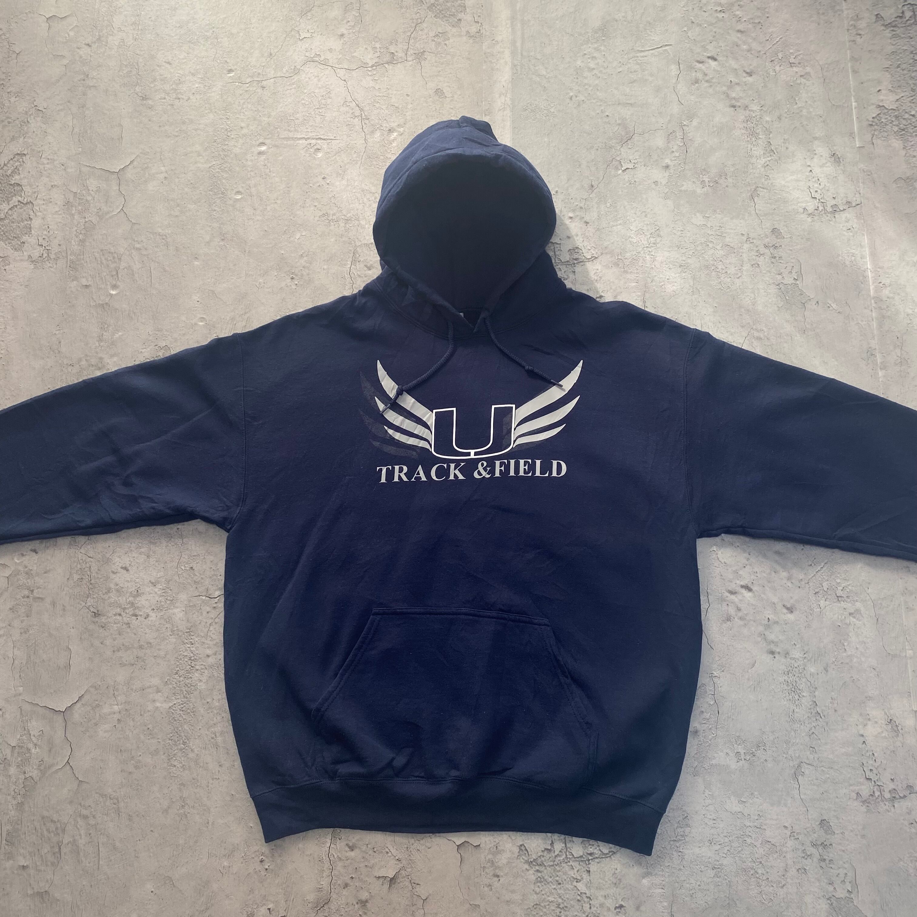 ギルダン USA古着 スクールロゴ プリント パーカー スウェット ネイビー L